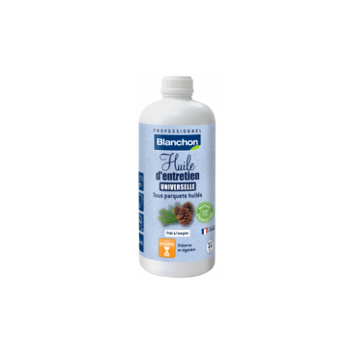 L’Huile d’Entretien Universelle Blanchon est une solution biosourcée pour l’entretien régulier de tous les parquets huilés, qu’ils soient traités en atelier ou sur chantier. Formulée avec 85 % d’ingrédients naturels, minéraux et biosourcés (dont 25 % de carbone biosourcé selon la norme NF EN 16640), elle régénère efficacement les finitions à l’huile, quel que soit leur type. Sans odeur, facile à appliquer au balai microfibre ou en spray, elle ne nécessite ni lustrage ni machine et permet une remise en circulation rapide des locaux (20 min).